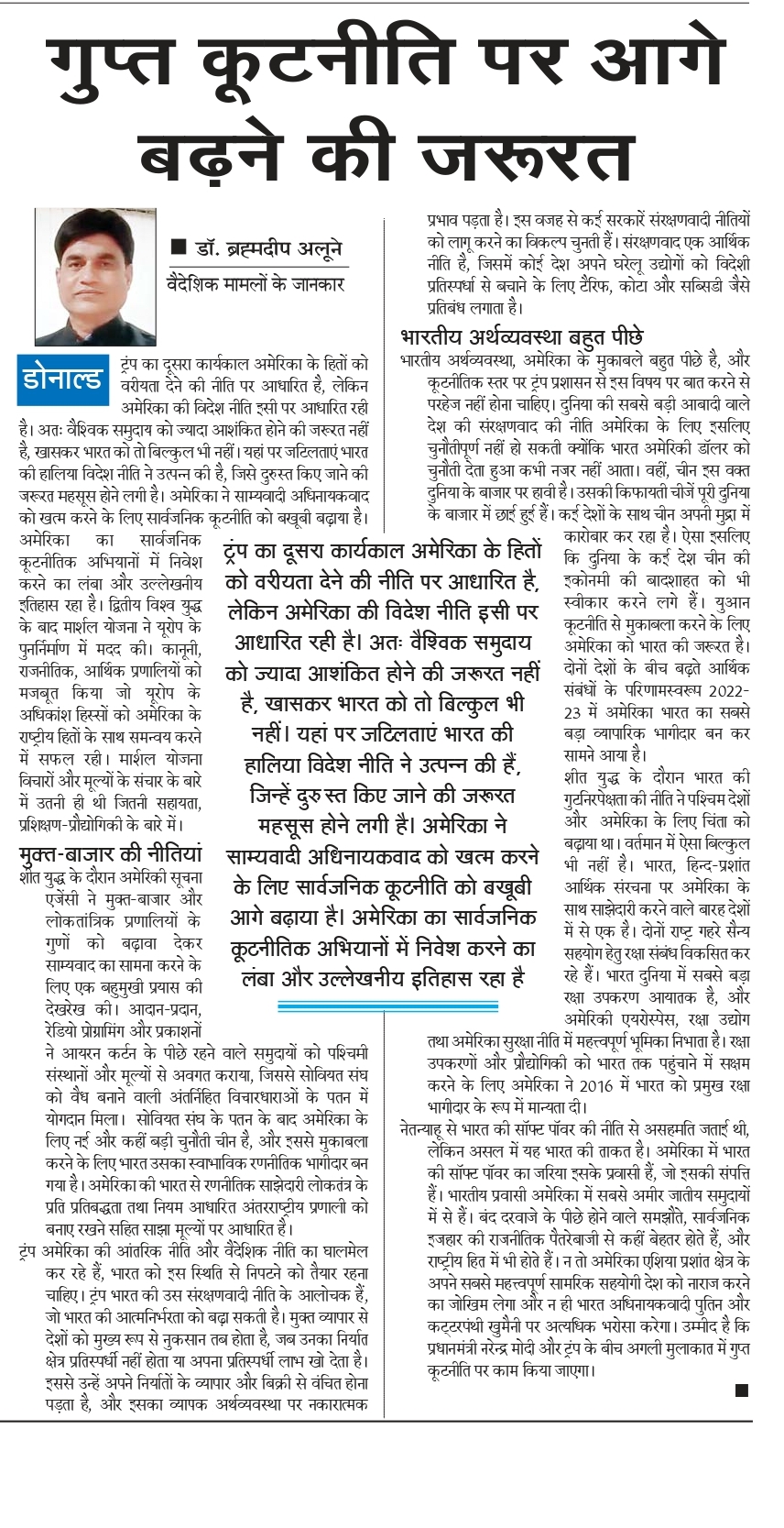 ट्रम्प का दूसरा कार्यकाल अमेरिका के हितों को वरीयता देने की नीति पर आधारित है,लेकिन अमेरिका की विदेश नीति इसी पर आधारित रही है। अत: वैश्विक समुदाय को ज्यादा आशंकित होने की जरूरत नहीं है,खासकर भारत को तो बिल्कुल भी नहीं। यहां पर जटिलताएं भारत की हालिया विदेश नीति ने उत्पन्न की है जिसे दुरुस्त किए जाने की जरूरत महसूस होने लगी है। अमेरिका ने साम्यवादी अधिनायकवाद को खत्म करने के लिए सार्वजनिक कूटनीति को बखूबी आगे बढ़ाया है. संयुक्त राज्य अमेरिका का सार्वजनिक कूटनीति अभियानों में निवेश करने का एक लंबा और उल्लेखनीय इतिहास रहा है। द्वितीय विश्व युद्ध के बाद,मार्शल योजना ने यूरोप के पुनर्निर्माण में मदद की। कानूनी, राजनीतिक और आर्थिक प्रणालियों को मजबूत किया जो यूरोप के अधिकांश हिस्सों को अमेरिका के राष्ट्रीय हितों के साथ समन्वय करने में सफल रही। मार्शल योजना विचारों और मूल्यों के संचार के बारे में उतनी ही थी जितनी कि सहायता,प्रशिक्षण और प्रौद्योगिकी के बारे में। शीत युद्ध के दौरान,अमेरिकी सूचना एजेंसी ने मुक्त-बाज़ार और लोकतांत्रिक प्रणालियों के गुणों को बढ़ावा देकर साम्यवाद का सामना करने के लिए एक बहुमुखी प्रयास की देखरेख की। आदान-प्रदान,रेडियो प्रोग्रामिंग और प्रकाशनों ने आयरन कर्टन के पीछे रहने वाले समुदायों को पश्चिमी संस्थानों और मूल्यों से अवगत कराया,जिससे सोवियत संघ को वैध बनाने वाली अंतर्निहित विचारधाराओं के पतन में योगदान मिला। सोवियत संघ के पतन के बाद अमेरिका के लिए नई और कहीं बड़ी चुनौती चीन है और इससे मुकाबला करने के लिए भारत उसका स्वभाविक रणनीतिक भागीदार बन गया है। अमेरिका की भारत से रणनीतिक साझेदारी लोकतंत्र के प्रति प्रतिबद्धता तथा नियम आधारित अंतर्राष्ट्रीय प्रणाली को बनाए रखने सहित साझा मूल्यों पर आधारित है।