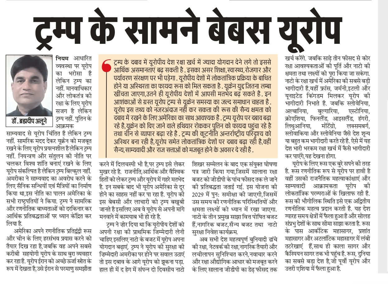 ट्रम्प के दबाव में यूरोपीय देश रक्षा खर्च में ज्यादा योगदान देने लगे तो इससे आर्थिक असमानताएं बढ़ सकती है। इसका असर शिक्षा,स्वास्थ्य,रोजगार और पर्यावरण संरक्षण पर भी पड़ेगा। यूरोपीय देशों में लोकतांत्रिक प्रक्रिया के बाधित होने या अस्थिरता का फायदा रूस को मिल सकता है। यूक्रेन युद्द जितना लम्बा खींचता जाएगा,उतने ही यूरोपीय देशों में आपसी मतभेद बढ़ सकते है। इन आशंकाओं से ग्रस्त यूरोप ट्रम्प से यूक्रेन समस्या का जल्द समाधान चाहता है। यूरोप इस तथ्य को नजरअंदाज नहीं कर सकता की रूस की सैन्य क्षमता को दबाव में रखने के लिए अमेरिका का साथ आवश्यक है। ट्रम्प यूरोप पर दबाव बढ़ा रहे है,यूक्रेन को दिए जाने वाले हथियार रोककर पुतिन को फायदा पहुंचा रहे है तथा चीन से व्यापार बढ़ा रहे है। ट्रम्प की कूटनीति अन्तर्राष्ट्रीय परिदृश्य को अस्थिर बना रही है,यूरोप समेत लोकतांत्रिक देशों पर दबाव बढ़ा रही है,वहीं सैन्य,साम्यवादी और राज सत्ताओं को मजबूत होने के अवसर दे रही है।