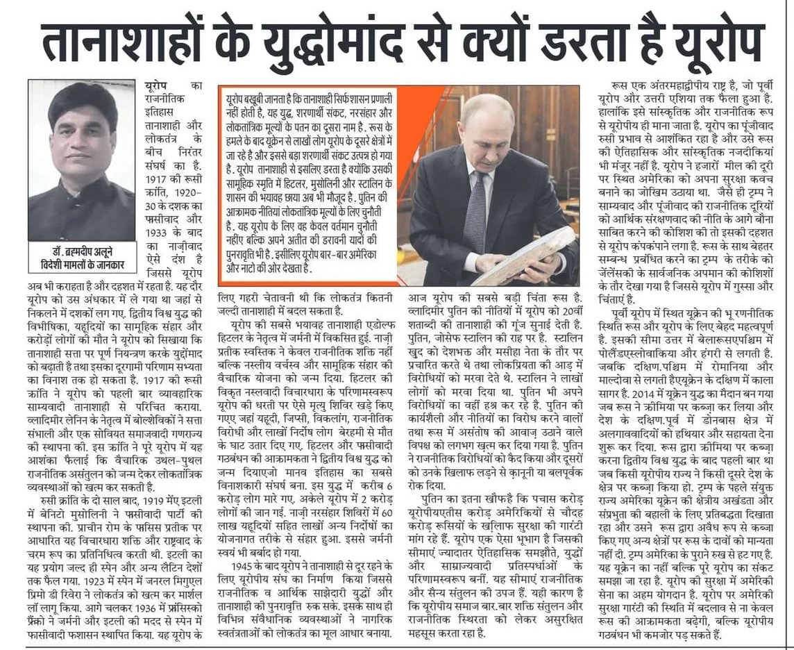 1945 के बाद यूरोप ने तानाशाही से दूर रहने के लिए यूरोपीय संघ का निर्माण किया जिससे राजनीतिक व आर्थिक साझेदारी युद्धों और तानाशाही की पुनरावृत्ति रुक सके। इसके साथ ही विभिन्न संवैधानिक व्यवस्थाओं ने नागरिक स्वतंत्रताओं को लोकतंत्र का मूल आधार बनाया। आज यूरोप की सबसे बड़ी चिंता रूस है। व्लादिमीर पुतिन की नीतियों में यूरोप को 20वीं शताब्दी की तानाशाही की गूंज सुनाई देती है। पुतिन,जोसेफ़ स्टालिन की राह पर है। स्टालिन ख़ुद को देशभक्त और मसीहा नेता के तौर पर प्रचारित करते थे तथा लोकप्रियता की आड़ में विरोधियों को मरवा देते थे। स्टालिन ने लाखों लोगों को मरवा दिया था। पुतिन भी अपने विरोधियों का वहीं हश्र कर रहे है। पुतिन की कार्यशैली और नीतियों का विरोध करने वालों तथा रूस में असंतोष की आवाज़ उठाने वाले विपक्ष को लगभग ख़त्म कर दिया गया है। पुतिन ने राजनीतिक विरोधियों को कैद किया और दूसरों को उनके खिलाफ लड़ने से क़ानूनी या बलपूर्वक रोक दिया। यूरोप बखूबी जानता है कि तानाशाही सिर्फ शासन प्रणाली नहीं होती है,यह युद्ध,शरणार्थी संकट,नरसंहार और लोकतांत्रिक मूल्यों के पतन का दूसरा नाम है। रूस के हमलें के बाद यूक्रेन सड़े लाखों लोग यूरोप के दूसरे क्षेत्रों में जा रहे है और इससे बड़ा शरणार्थी संकट उत्पन्न हो गया है। यूरोप तानाशाही से इसलिए डरता है क्योंकि उसकी सामूहिक स्मृति में हिटलर,मुसोलिनी और स्टालिन के शासन की भयावह छाया अब भी मौजूद है। पुतिन की आक्रामक नीतियां लोकतांत्रिक मूल्यों के लिए चुनौती है। यह यूरोप के लिए वह केवल वर्तमान चुनौती नहीं, बल्कि अपने अतीत की डरावनी यादों की पुनरावृत्ति भी है। इसीलिए यूरोप बार-बार अमेरिका और नाटो की ओर देखता है। पुतिन का इतना खौफ है कि पचास करोड़ यूरोपीय,तीस करोड़ अमेरिकियों से चौदह करोड़ रूसियों के ख़िलाफ़ सुरक्षा की गारंटी मांग रहे हैं। यूरोप एक ऐसा भूभाग है जिसकी सीमाएं ज्यादातर ऐतिहासिक समझौते,युद्धों और साम्राज्यवादी प्रतिस्पर्धाओं के परिणामस्वरूप बनीं। यह सीमाएं राजनीतिक और सैन्य संतुलन की उपज हैं। यही कारण है कि यूरोपीय समाज बार-बार शक्ति संतुलन और राजनीतिक स्थिरता को लेकर असुरक्षित महसूस करता रहा है।