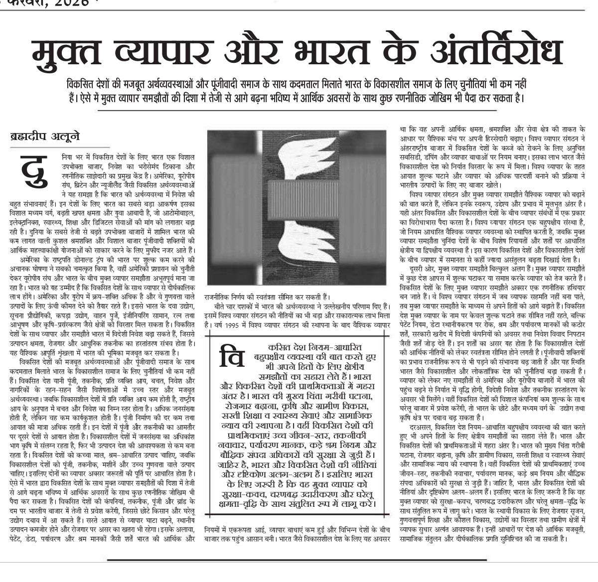 विश्व व्यापार संगठन और मुक्त व्यापार समझौते के बीच विरोधाभास का सबसे बड़ा असर यह है कि विकसित देश नियम-आधारित बहुपक्षीय व्यवस्था की बात करते हुए भी अपने हितों के लिए क्षेत्रीय समझौतों का सहारा लेते हैं। भारत और विकसित देशों की प्राथमिकताओं में गहरा अंतर है। भारत की मुख्य चिंता गरीबी घटाना,रोजगार बढ़ाना,कृषि व ग्रामीण विकास,सस्ती शिक्षा-स्वास्थ्य और सामाजिक न्याय की स्थापना है। वहीं विकसित देशों की प्राथमिकताएं उच्च जीवन-स्तर,तकनीकी नवाचार,पर्यावरण मानक,कड़े श्रम नियम और बौद्धिक संपदा अधिकारों की सुरक्षा से जुड़ी हैं। जाहिर है भारत और विकसित देशों की नीतियां और दृष्टिकोण अलग-अलग हैं। अतः भारत के लिए जरूरी है कि वह मुक्त व्यापार को सुरक्षा-कवच,चरणबद्ध उदारीकरण और घरेलू क्षमता-वृद्धि के साथ संतुलित रूप में लागू करे। भारत के स्थायी विकास के लिए रोजगार सृजन, गुणवत्तापूर्ण शिक्षा और कौशल विकास,उद्योगों का विस्तार तथा ग्रामीण क्षेत्रों में व्यापक सुधार अत्यंत आवश्यक हैं। इन्हीं आधारों पर देश की आर्थिक मजबूती, सामाजिक संतुलन और दीर्घकालिक प्रगति सुनिश्चित की जा सकती है।