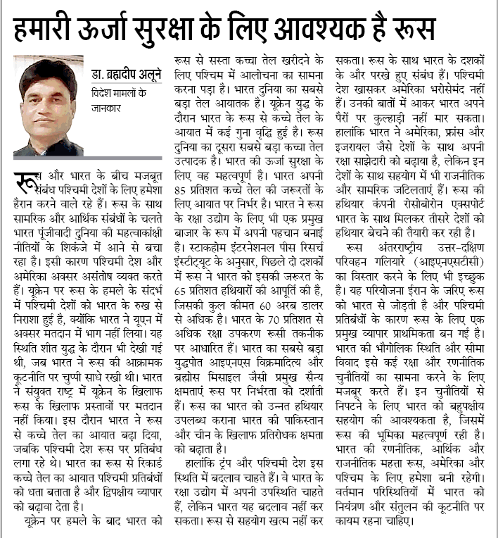 सबसे बड़ा ऊर्जा उपभोक्ता है और अपनी 85 फीसद कच्चे तेल की ज़रूरतों के लिए आयात पर निर्भर है। ऐसे में भारत ने ऊर्जा सुरक्षा सुनिश्चित करने के लिए रणनीतिक निर्णय लिया है। भारत रूसी रक्षा उद्योग के लिए एक प्रमुख बाजार है। स्टॉकहोम इंटरनेशनल पीस रिसर्च इंस्टिट्यूट के मुताबिक पिछले दो दशकों के दौरान मॉस्को ने भारत की पैंसठ फीसदी हथियार खरीद की सप्लाई की जिसकी कुल कीमत साठ अरब डॉलर से अधिक थी। भारत के सत्तर फीसदी से अधिक रक्षा उपकरण रूसी तकनीक या प्लेटफॉर्म पर आधारित हैं। इन हथियारों और मशीनों की मेंटनेंस,सर्विसिंग के साथ उनके स्पेयर पार्ट्स को अपग्रेड करने के मामलें में भारत पूरी तरह से रूस पर निर्भर है। शीत युद्ध काल से ही रूस भारत का विश्वसनीय रणनीतिक साझेदार रहा है। 1971 के भारत-पाकिस्तान युद्ध में सोवियत समर्थन ने भारत की रणनीतिक स्थिति को मजबूत किया। रूस ने कई बार अंतरराष्ट्रीय मंचों पर भारत का समर्थन किया,जबकि पश्चिमी देश अक्सर तटस्थ रहे।