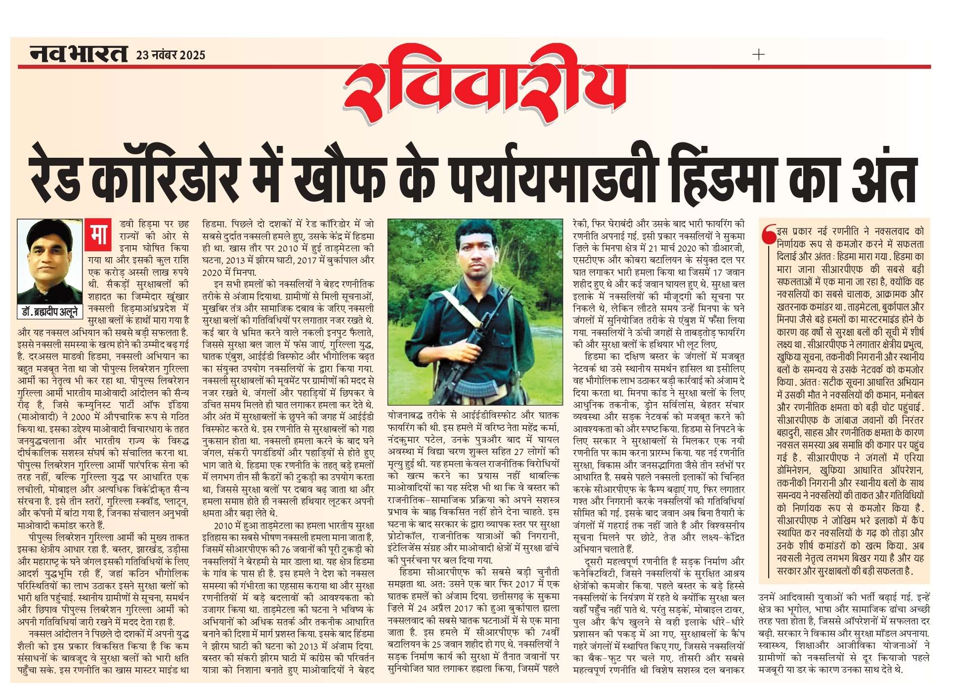 इस प्रकार नई रणनीति ने नक्सलवाद को निर्णायक रूप से कमजोर करने में सफलता दिलाई और अंततः हिडमा मारा गया।हिडमा का मारा जाना सीआरपीएफ की सबसे बड़ी सफलताओं में एक माना जा रहा है,क्योंकि वह नक्सलियों का सबसे चालाक,आक्रामक और खतरनाक कमांडर था। ताड़मेटला, बुर्कापाल और मिनपा जैसे बड़े हमलों का मास्टरमाइंड होने के कारण वह वर्षों से सुरक्षा बलों की सूची में शीर्ष लक्ष्य था। सीआरपीएफ ने लगातार क्षेत्रीय प्रभुत्व,खुफिया सूचना,तकनीकी निगरानी और स्थानीय बलों के समन्वय से उसके नेटवर्क को कमजोर किया। अंततः सटीक सूचना आधारित अभियान में उसकी मौत ने नक्सलियों की कमान, मनोबल और रणनीतिक क्षमता को बड़ी चोट पहुंचाई।सीआरपीएफ के जांबाज़ जवानों की निरंतर बहादुरी,साहस और रणनीतिक क्षमता के कारण नक्सल समस्या अब समाप्ति की कगार पर पहुंच गई है। सीआरपीएफ ने जंगलों में एरिया डोमिनेशन,खुफिया आधारित ऑपरेशन,तकनीकी निगरानी और स्थानीय बलों के साथ समन्वय ने नक्सलियों की ताकत और गतिविधियों को निर्णायक रूप से कमजोर किया है। सीआरपीएफ ने जोखिम भरे इलाकों में कैंप स्थापित कर नक्सलियों के गढ़ को तोड़ा और उनके शीर्ष कमांडरों को खत्म किया। अब नक्सली नेतृत्व लगभग बिखर गया है और यह सरकार और सुरक्षाबलों की बड़ी सफलता है।