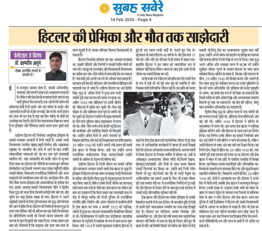 ईवा ब्राउन और हिटलर का संबंध इतिहास के सबसे विवादित प्रसंगों में से एक है,फिर भी मानवीय दृष्टि से देखें तो इसमें गहरे भावनात्मक समर्पण का तत्व स्पष्ट दिखाई देता है। हिटलर का व्यक्तित्व अत्यंत नियंत्रक और आत्मकेंद्रित था, और ईवा को लंबे समय तक सार्वजनिक पहचान नहीं मिली। वे सत्ता के केंद्र के निकट होते हुए भी छाया में रहीं। यह स्थिति किसी भी व्यक्ति को भीतर से तोड़ सकती थी,किंतु ईवा का भावनात्मक जुड़ाव कम नहीं हुआ। उन्होंने अपने संबंध को प्रदर्शन या प्रतिष्ठा का माध्यम नहीं बनाया,बल्कि निजी निष्ठा के रूप में जिया। जब युद्ध अपने अंतिम और भयावह चरण में था,तब भी उन्होंने सुरक्षित जीवन चुनने के बजाय हिटलर के साथ रहना स्वीकार किया। बर्लिन के बंकर में, विनाश और पराजय के बीच,29 अप्रैल 1945 को विवाह करना और अगले ही दिन साथ मृत्यु को स्वीकार करना,यह उनके दृष्टिकोण से प्रेम की चरम अभिव्यक्ति थी। इतिहास की कठोर पृष्ठभूमि से अलग, यह प्रसंग इस रूप में भी देखा जा सकता है कि किसी व्यक्ति के प्रति अडिग निष्ठा और भावनात्मक समर्पण कितनी दूर तक जा सकता है। यह प्रेम की जटिल, किंतु गहन मानवीय अभिव्यक्ति का उदाहरण है।